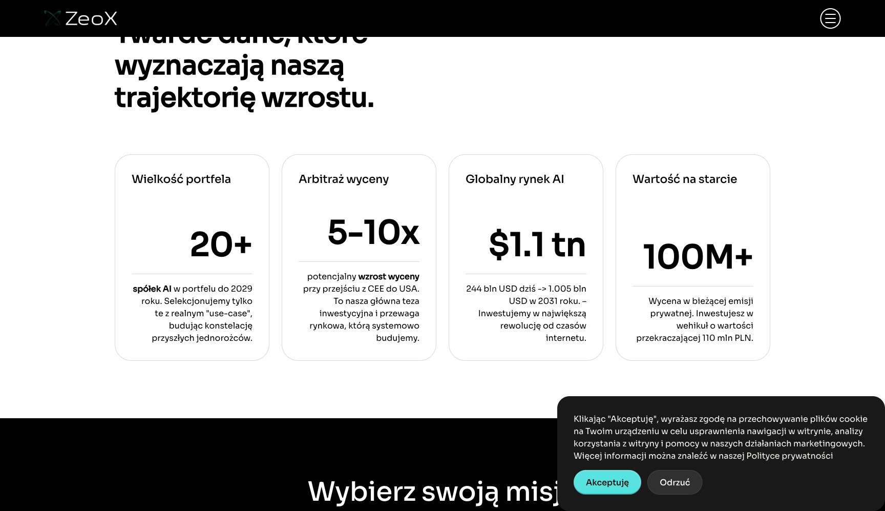 Zeox was launching a new investment vehicle targeting 20+ AI companies with a 100M+ PLN valuation. They had no brand, no website, no investor materials, and no content strategy. They needed to look like a tier-1 fund from day one — credible enough for institutional LPs, exciting enough for AI founders, and clear enough for corporate clients looking to adopt AI.