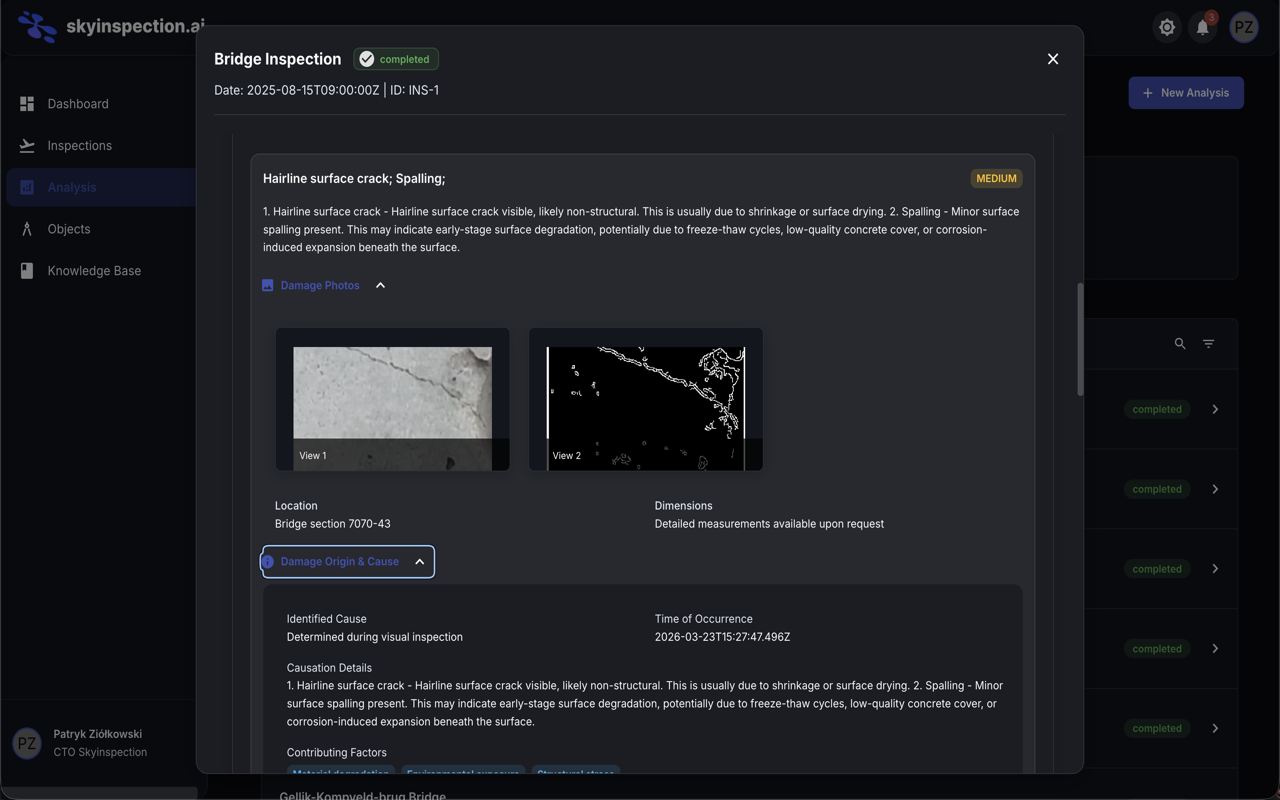 Full inspection management platform. Dashboard with stats (objects, completed inspections, damages, drones, certifications, critical alerts). Inspection list with operator and drone tracking. 3D model viewer with annotated defects and severity classification. AI damage analysis with photos, cause identification, and contributing factors.