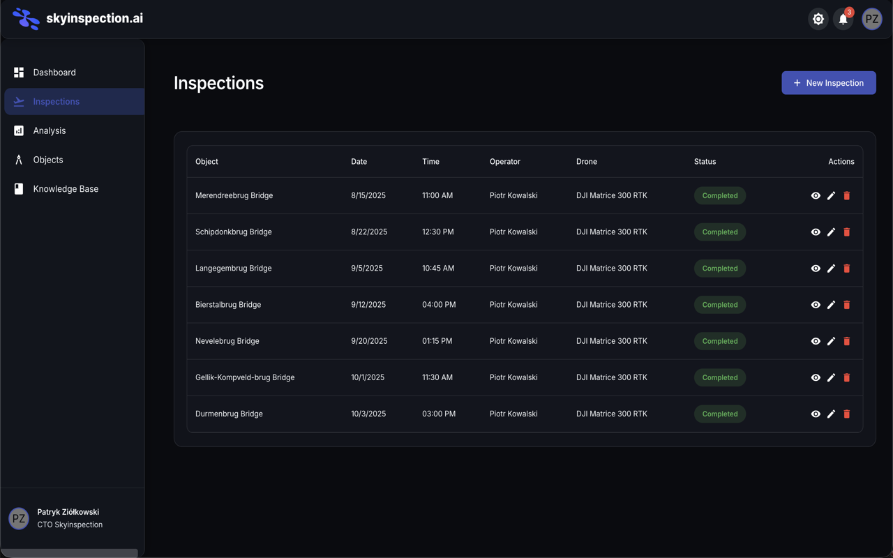 Phase 1: Market research — competitor landscape, pricing analysis, customer interviews with procurement officers at energy companies. Understood what makes enterprise buyers say yes. Phase 2: Brand identity — blue accent on dark backgrounds, technical aesthetic inspired by aviation instruments. Logo, typography, visual system. Phase 3: Landing page — hero with drone footage, partnership logos (Orlen, Siemens, Energa, PARP), feature cards, stats (60% cost reduction, 99.9% detection accuracy), embedded demo video, contact form. Phase 4: PoC application — full inspection management dashboard with 3D model viewer (bridge inspections with annotated defects), AI damage analysis (crack detection, severity classification, damage photos), inspection list with operator/drone/status tracking, critical alerts system. Phase 5: Premium video — human-filmed production for investor presentations and enterprise sales meetings.