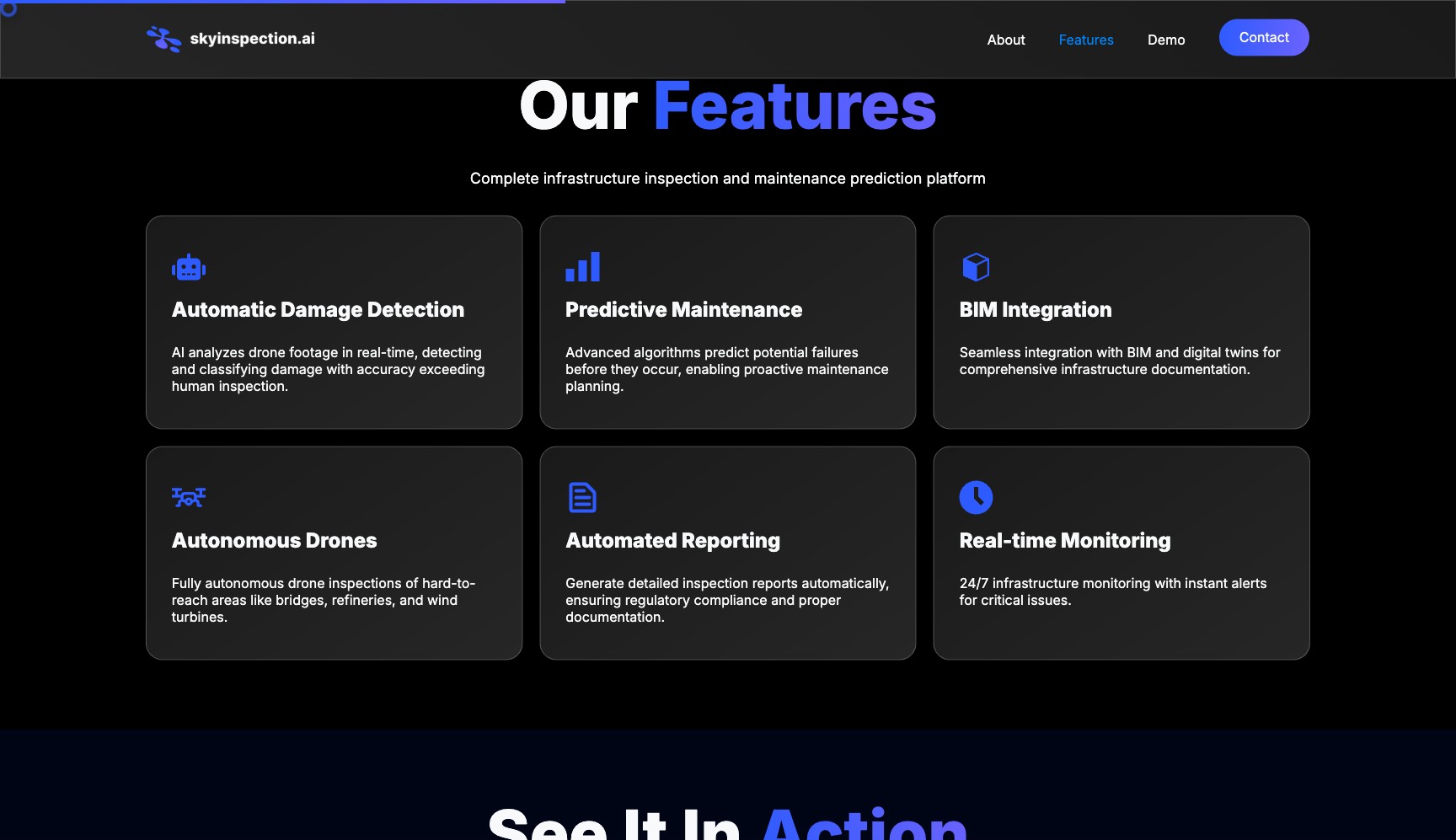 SkyInspection uses autonomous drones and AI to inspect critical infrastructure — bridges, power lines, wind turbines, refineries. We built the brand from zero, conducted market research, designed the landing page, developed the PoC application with 3D model viewer and AI damage detection, and produced a premium human-filmed video for investor and enterprise presentations.